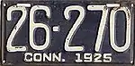 1925 | Embossed white serial on navy blue plate; "CONN. 1925" centered at bottom | 123-456 | 1 to approximately 104-000 | |