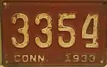 1933 | Embossed white serial on maroon plate; "CONN. 1933" at bottom | 1234 | Issued in blocks by branch office | |