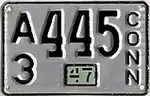 1937–41 | Embossed black serial on silver plate; vertical "CONN" at right; tab box at bottom center | 1234 | 1 to 9999 | Validated for 1937, 1940 and 1943 with yellow tabs; for 1938, 1941 and 1946 with silver tabs; for 1939, 1942, 1945 and 1947 with light green tabs; and for 1944 with white tabs. In the A/1 123 serial format, the letter progressed before the small number (A/2 through Z/2, then A/3 through Z/3, etc.).[4] |