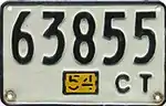 1948–51 | Embossed black serial on reflective aluminum plate with border line; "CT" at bottom right; tab box at bottom center | 1234 | 1 to 9999 | Validated for 1948, 1951 and 1954 with yellow tabs; for 1949 and 1952 with silver tabs; for 1950 and 1955 with light green tabs; and for 1953 and 1956 with red tabs. |
