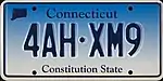 Embossed dark blue serial on reflective gradient sky blue and white plate with dark blue border line; "Connecticut" screened in dark blue centered at top; screened dark blue state shape at top left | "Constitution State" screened in dark blue centered at bottom | 123·ABC2 | 100·NZN to 999·ZZX | 'O' series not used; 'V' series reserved for Veteran plates. |