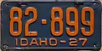 1927 Embossed orange serial on dark blue plate, "IDAHO–27" at bottom none 12-345 1 to approximately 95-000