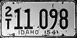 1942–44 Embossed dark blue serial on white plate; "42" at bottom right "SCENIC IDAHO" at bottom, offset to left 1A-12-345 Coded by county of issuance (1A) Revalidated for 1943 and 1944 with windshield stickers, due to metal conservation for World War II.