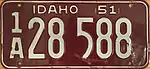 1951–52 Embossed white serial on maroon plate with border line; "IDAHO 51" centered at top none A 12345