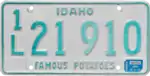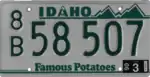 1982–85 Embossed green serial on white plate; "IDAHO" screened in green centered at top, with the 'A' resembling a mountain peak "Famous Potatoes" screened in green centered at bottom Serials in each county continued from where the 1974–82 plates left off.