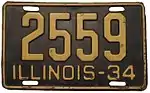 1934 | Yellow on black with border line; "ILL-34", "ILLINOIS-34" or "ILLINOIS-1934" at bottom (see right) | none | 1-234-567 | 1 to approximately 1-285-000 | Plates with serials 1 through 999 had "ILL-34" at the bottom; plates with serials 1000 through 9999 had "ILLINOIS-34"; and plates with serials 10-000 and up had "ILLINOIS-1934". The latter two groups were the first plates to feature the full state name. |
