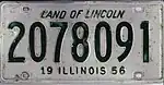 In 1956, the United States, Canada, and Mexico came to an agreement with the American Association of Motor Vehicle Administrators, the Automobile Manufacturers Association and the National Safety Council that standardized the size for license plates for vehicles (except those for motorcycles) at 6 inches (15 cm) in height by 12 inches (30 cm) in width, with standardized mounting holes.[2] The 1956 (dated 1957) issue was the first Illinois license plate that fully complied with these standards: the 1955 (dated 1956) issue was 6 inches in height by 12 inches in width, but had non-standard mounting holes.