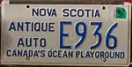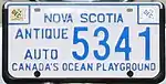 Antique Auto Embossed blue serial on white plate; border lines around plate and around top corners; "NOVA SCOTIA" and "CANADA'S OCEAN PLAYGROUND" centred at top and bottom respectively, "ANTIQUE AUTO" on left side of number. 1234 0001 to 9999