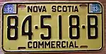 Commercial 1978–2012 Embossed black serial on yellow plate; border lines around plate and around top corners; "NOVA SCOTIA" and "COMMERCIAL" centred at top and bottom respectively 12-345-A 10-000-A to 37-519-D Currently issued to commercial vehicles above 5,000 kg (11,000 lb). Passenger plates issued to lighter commercial vehicles since 1986.[4]