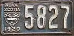 1920 Embossed white serial on dark blue plate with border line; "NOVA SCOTIA", provincial shield and "1920" at left 12345 1001 to approximately 12500 First embossed plate.