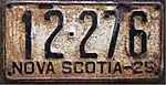 1925 Embossed black serial on white plate with border line; "NOVA SCOTIA–25" at bottom 12-345 1-001 to approximately 21-000