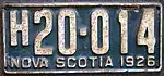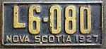 1926 Embossed white serial on dark green plate with border line; "NOVA SCOTIA 1926" at bottom L12-345 L1-001 to approximately L11-500 'L' prefix used for vehicles weighing 3,000 lb or less, and 'H' prefix for vehicles above 3,000 lb. This happened again in 1927.[3]