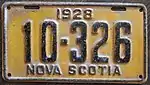 1928 Embossed black serial on orange plate with border line; "1928" and "NOVA SCOTIA" centred at top and bottom respectively 12-345 10-001 to approximately 27-500 No letter prefix used for vehicles weighing 3,000 lb or less.