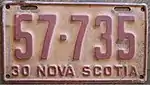 1930 Embossed red serial on white plate with border line; "30 NOVA SCOTIA" at bottom 12-345 40-001 to approximately 85-000