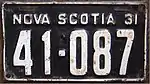 1931 Embossed white serial on black plate with border line; "NOVA SCOTIA 31" at top 12-345 Coded by county group (1)