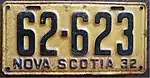 1932 Embossed black serial on yellow plate; "NOVA SCOTIA 32" at bottom 12-345 Coded by county group (1)