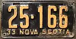 1933 Embossed orange serial on black plate; "33 NOVA SCOTIA" at bottom 12-345 Coded by county group (1)