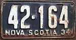 1934 Embossed white serial on dark blue plate; "NOVA SCOTIA 34" at bottom 12-345 Coded by county group (1)