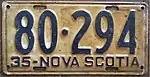 1935 Embossed dark blue serial on white plate; "35-NOVA SCOTIA" at bottom 12-345 Coded by county group (1)