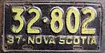 1937 Embossed yellow serial on black plate; "37-NOVA SCOTIA" at bottom 12-345 Coded by county group (1)