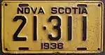 1938 Embossed black serial on yellow plate; "NOVA SCOTIA" and "1938" centred at top and bottom respectively 12-345 Coded by county group (1)
