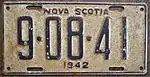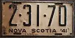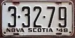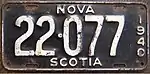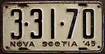 1943–44 Embossed white serial on black plate with border line; "NOVA SCOTIA" and "1943" centred at top and bottom respectively 1-23-45 Coded by county group (1) Restamped and repainted 1942 plates. Revalidated for 1944 with windshield stickers.