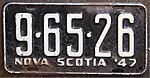 1947 Embossed white serial on black plate with border line; "NOVA SCOTIA '47" at bottom 1-23-45 Coded by county group (1)