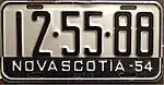 1953 As above, but with "NOVA SCOTIA - 53" at bottom 12-34-56 10-00-00 to 10-99-99 Issued only to new registrants. Validated for 1954, 1955 and 1956 in the same manner as for 1952 plates.