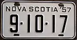 1957 Embossed black serial on white plate with border line; "NOVA SCOTIA '57" at top 1-23-45