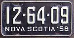 In 1956, Canada, the United States, and Mexico came to an agreement with the American Association of Motor Vehicle Administrators, the Automobile Manufacturers Association and the National Safety Council that standardized the size for licence plates for vehicles (except those for motorcycles) at 6 inches (15 cm) in height by 12 inches (30 cm) in width, with standardized mounting holes.[2] The first Nova Scotia licence plate that complied with these standards was issued fifteen years beforehand, in 1941.