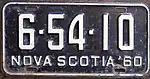 1960–61 Embossed light yellow serial on black plate with border line; "NOVA SCOTIA '60" at bottom none 1-23-45