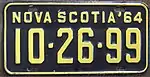 1964–65 Embossed yellow serial on black plate with border line; "NOVA SCOTIA '64" at top none 1-23-45