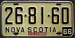 1966–68 Embossed black serial on yellow plate with border line; "NOVA SCOTIA" at bottom, offset to left; black box at bottom right containing debossed "66" none 1-23-45