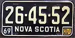 1969–71 Embossed yellow serial on black plate; border lines around plate and around bottom corners; "NOVA SCOTIA" centred at bottom; "69" at bottom left none 1-23-45