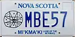 June 2018 Embossed blue serial on white plate; eight-point star petroglyph screened at left; "NOVA SCOTIA" screened in blue centred at top "MI'KMA'KI LAND OF THE MI'KMAQ" screened in blue centred at bottom MBC12 MAA01 to MBL98 (as of September 27, 2021)