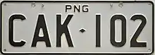 Papua New Guinea requires its residents to register their motor vehicles and display vehicle registration plates.[1] Current plates are Australian standard 372 mm × 134 mm, and use Australian stamping dies.[2] As of 2023, most private and commercial motor vehicles use standard white plates with black lettering. Special number plates are issued to Consular staff, Diplomatic staff, Government owned vehicles, motorcycles, public motor vehicles (buses), taxis, trailers and to those engaged in selling or repairing vehicles.