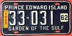 1962–63 | Embossed white serial on dark blue plate with border line; "PRINCE EDWARD ISLAND" at top; white box at right containing debossed "62" | "GARDEN OF THE GULF" at bottom | 12-345 | 20-001 to approximately 47-000 | Revalidated for 1963 with stickers. |