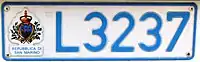 Sammarinese authorities license private vehicles with distinctive licence plates which are white with blue figures, usually a letter followed by up to four numbers. To the left of these figures is displayed the national coat of arms of San Marino. Many vehicles also carry the international vehicle identification code "RSM" in black on a white oval sticker. Since 2004 custom licence plates have also become available.
