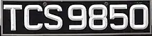 Apart from the font and colour scheme, various styles of number plates can be bought such as: "Embossed" which are a machine stamped type metal plate that usually cost approximately TT$200 per pair, "Lenny's", a term derived based on the alleged inventor of the style,[6] or "Bones" which are the 3D, beveled letters that can be either black or white affixed to a white or black metal backing this usually costs approximately upwards of $600TT per pair or the regular plastic plates that are made with graphics these usually cost approx $80TT per pair. There are also much other variants such as reflective backgrounds for both "Lenny's" or "Embossed" but those are a bit more expensive.[6] Further to this, there are also physical dimensions of the number plate that are important. Different vehicles may require different types of plates due to physical space available to mount the number plate. Meaning therefore, to select a plate for a vehicle the owner has three different characteristics to consider before doing so such as: colour scheme, style and type.[7] There are two types of number plates that are available: Rectangular and Squared plates: