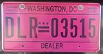 Temporary registration issued by new car dealer | c. 2008–present | Pink on white cardboard. | 12NC345 | Issued only by Tesla, Inc. since 2014, when the only other new car dealerships in D.C. moved to Maryland. |