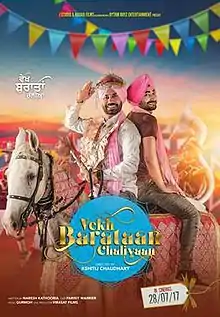 Vekh Baraatan Challiyan is a 2017 Indian romantic comedy film directed by Ksshitij Chaudhary and written by Naresh Kathooria. Its principal cast includes Binnu Dhillon, Ranjit Bawa, Kavita Kaushik, Jaswinder Bhalla, Karamjit Anmol. The film is produced by Karaj Gill, Amiek Virk & Jaspal Singh Sandhu. It was released worldwide on 28 July 2017.[2]