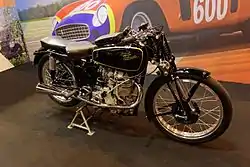 The Velocette KTT Mk VIII is a British racing motorcycle made by Veloce, Ltd. who built motorcycles named the Velocette. The Mk VIII KTT was ultimate development of their K series of overhead-camshaft 350cc machines introduced in 1925, and the TT designation indicated a production racing motorcycle, and a near replica of the factory race team machines. Production continued until 1950.[1]