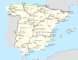 The line branches from the Madrid–Hendaye railway at Venta de Baños, and serves Palencia, León and Oviedo before reaching Gijón. At León, the León–A Coruña railway starts.