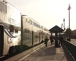 Six Metrolink Ventura County Line trains (three in each direction) serve the station each weekday, running during peak hours in the peak direction of travel. Two round trips operate on weekends.[4]