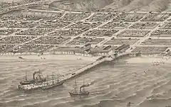 On May 20, 1871, two meetings of San Buenaventura citizens were held at Spear's Hall, one in the morning and a follow-up in the evening, to discuss the construction of a wharf in Ventura. Articles of incorporation and bylaws were adopted for the formation of a company to undertake the project.[14] Joseph Wolfson and his father-in-law Juan Camarillo were principal forces behind the wharf.[15]