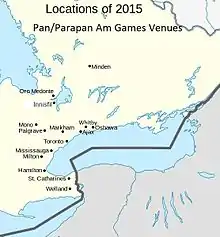The 2015 Pan and Parapan American Games venues were mostly located in the host city of Toronto, Ontario, though some events required facilities located elsewhere. Besides Toronto, fourteen other municipalities in Southern Ontario hosted competitions: Ajax, Hamilton, Innisfil, Markham, Milton, Minden, Mississauga, Mono, Oro-Medonte, Oshawa, Palgrave, St. Catharines, Welland and Whitby.[1][2]