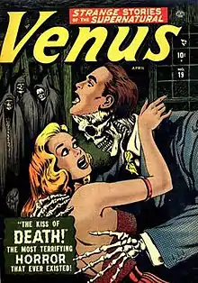 From issue 10 the title took on a science fiction slant, and included stories by Russ Heath and Joe Maneely.[1] By issue 11 the comic added the slogan "Strange Stories of the Supernatural" and though the tales still included Venus and other supporting characters, the comic began to morph into a horror/sci-fi anthology. In issue 12 Loki is joined by Thor to rescue Venus from the clutches of the evil sultan Khorak,[3] though this version of Thor is not recognized as a first appearance. By issue 17 the romance angle was dropped and Venus became a horror anthology, with the cover drawn by Bill Everett, and is classed as a bondage comic cover as it shows Venus chained to a dungeon wall.[1] Everett supplied the covers for the final two issues as well as interior art, and issue nineteen is a classic pre-Comic Code horror book cover with Venus being embraced by a living skeleton.[1]