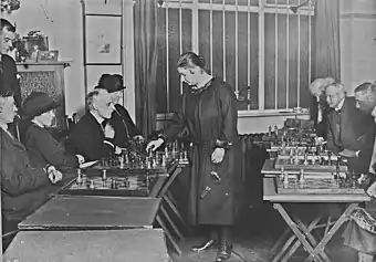 When Menchik arrived in England, she could only speak Russian. She began to focus more on chess in part because she did not need to know English well to play. Menchik joined the Hastings Chess Club in March 1923 at age 17.[11][4] The club was highly-renowned, having already begun to host the Hastings International Chess Christmas Congress, an annual tournament that featured some of the best players in the world.[8] She had considered joining the club for over a year before finally doing so.[9] Menchik's first coach at the club was James Drewitt, the club champion that year.[11][12] In the later part of the year, she began taking private lessons with Géza Maróczy, a Hungarian who later became one of the inaugural players to be awarded the Grandmaster (GM) title in 1950.[13] This coaching made her one of the only female chess players at the time to partake in formal training.[8] Menchik was only able to work with Maróczy until early 1924 when he left England to go to the United States. At this point, she resumed training with Drewitt. Although she only trained with Maróczy for a short time, she credited him with inspiring her to try and compete at a higher level.[9]