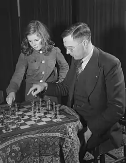 Two of the most notable open international tournaments Menchik in which participated in the 1930s were in Maribor in Yugoslavia and in Moscow. The Maribor tournament in August 1934 was one of Menchik's biggest successes in open international tournaments. Menchik finished in third place out of nine with a score of 5/8 behind only Vasja Pirc and Lajos Steiner, both of whom would be named inaugural International Masters by FIDE in 1950. The players she finished ahead of included Josef Rejfíř, Lajos Asztalos, and Milan Vidmar Jr., who all received the International Master title, and Rudolf Spielmann.[52] On New Year's Day the next year, Menchik made a draw against Euwe at the Christmas Congress, their last encounter.[53] The Moscow tournament in 1935 was similar to Carlsbad in 1929 in terms of the size and in that it featured many of the world's top players. It was also an opportunity for Menchik to return to her hometown. She did not fare well, scoring 1½/19 with no wins and three draws. Her best game result was a draw against Salo Flohr, who finished in joint first place with Mikhail Botvinnik. This draw was well-received by the Moscow public, in part because it helped the Soviet player Botvinnik finish in joint first instead of second to Flohr. Menchik attributed her general poor results at the tournament to spending her free time exploring the city.[54][55]