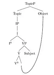 In Tagalog, there can be adverbs between the verb and the object in VOS order, implying that the verb and the object can be separated, and do not form a constituent.[4] In Tongan, there is an asymmetry between case-marked arguments and clitic pronouns: the clitics surface pre-verbally, whereas the case-marked nouns can only surface post-verbally (Otsuka 2005). Otsuka (2005) proposed that the subject clitic undergoes head-movement to T0, and attaches to the verb, whereas the case-marked subject moves to Spec-TP. She concludes that only verb head-movement can explain such a syntactic asymmetry in Tongan.